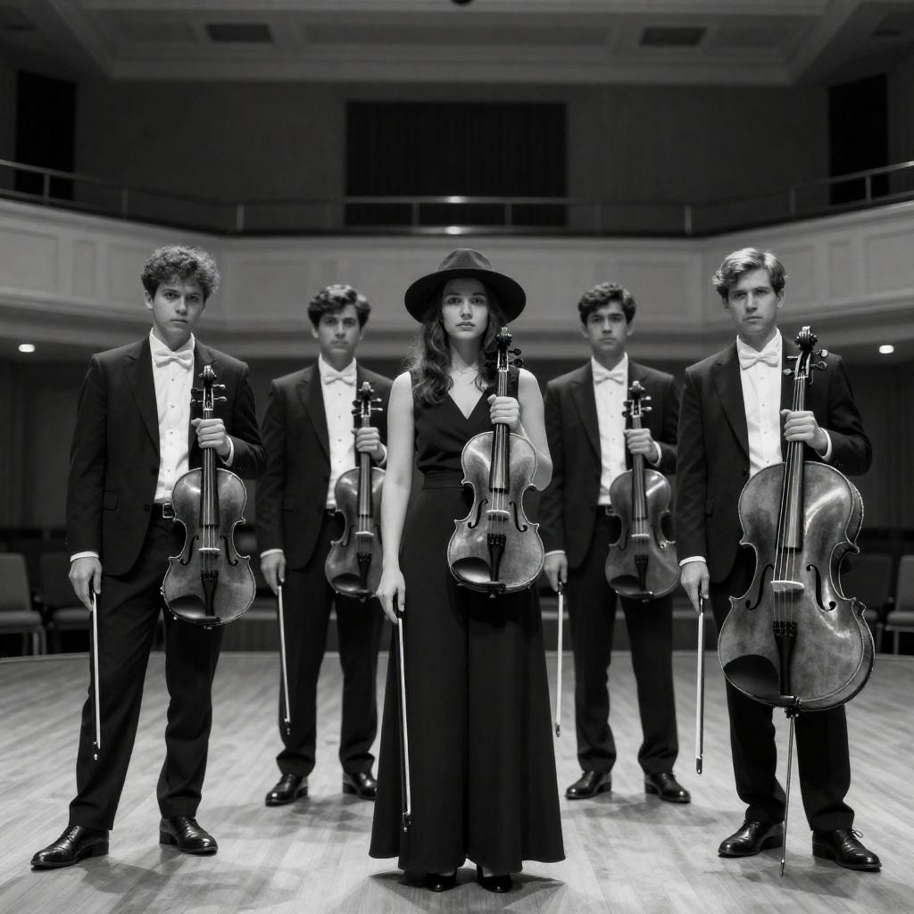 Black-and-white photograph of a brass band performing in an ornate room. Musicians in dark suits and white shirts stand in a semi-circle, playing brass instruments. A grand curtain and decorative wall art adorn the background. A table with sheet music and instruments is on the right. The image has a high-contrast, almost surreal style.