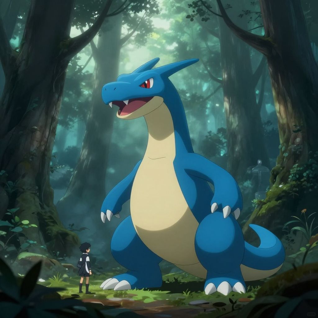 A detailed digital illustration of Gyarados, a large blue serpentine Pokémon with red eyes and sharp fangs, set in a misty, dense forest. The scene includes a small figure wearing a black and white outfit, standing near the giant Gyarados. The background consists of tall trees and dappled sunlight filtering through the canopy, creating a mysterious and dramatic atmosphere.