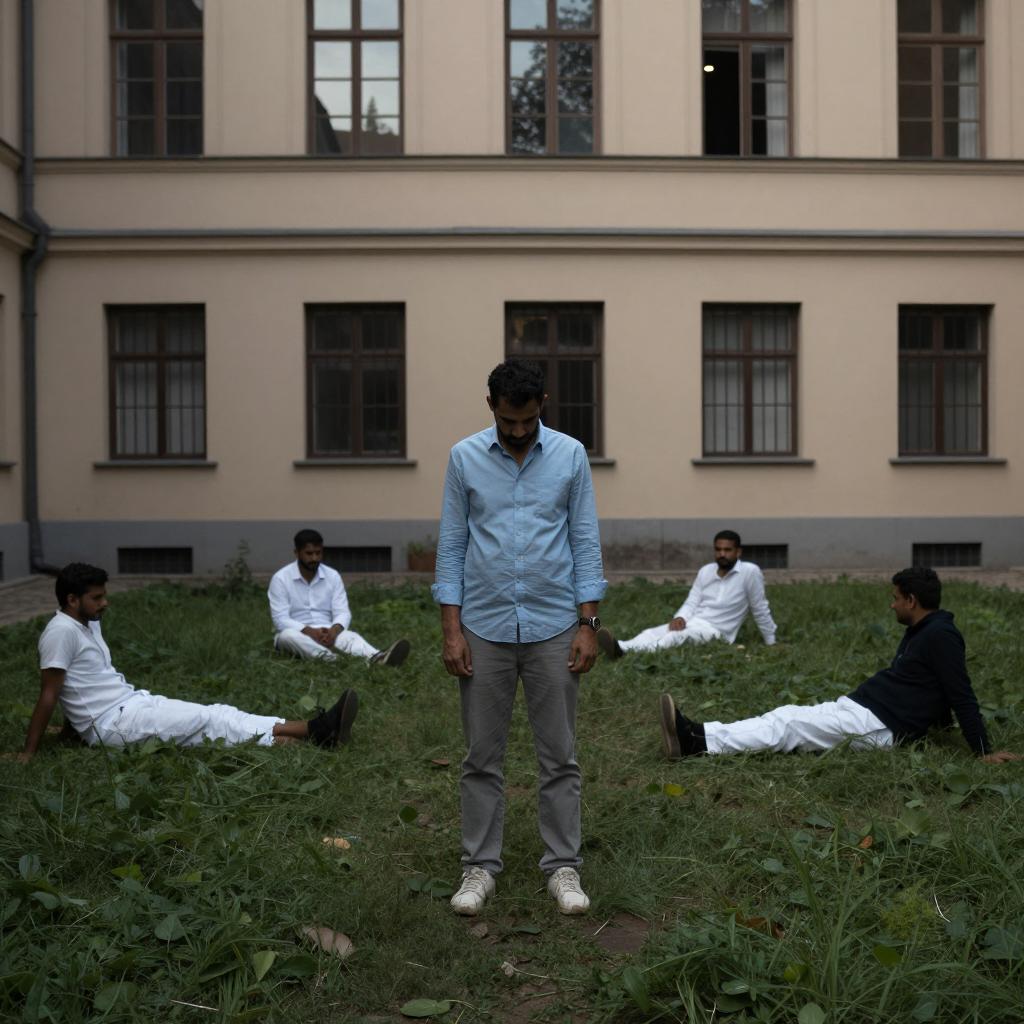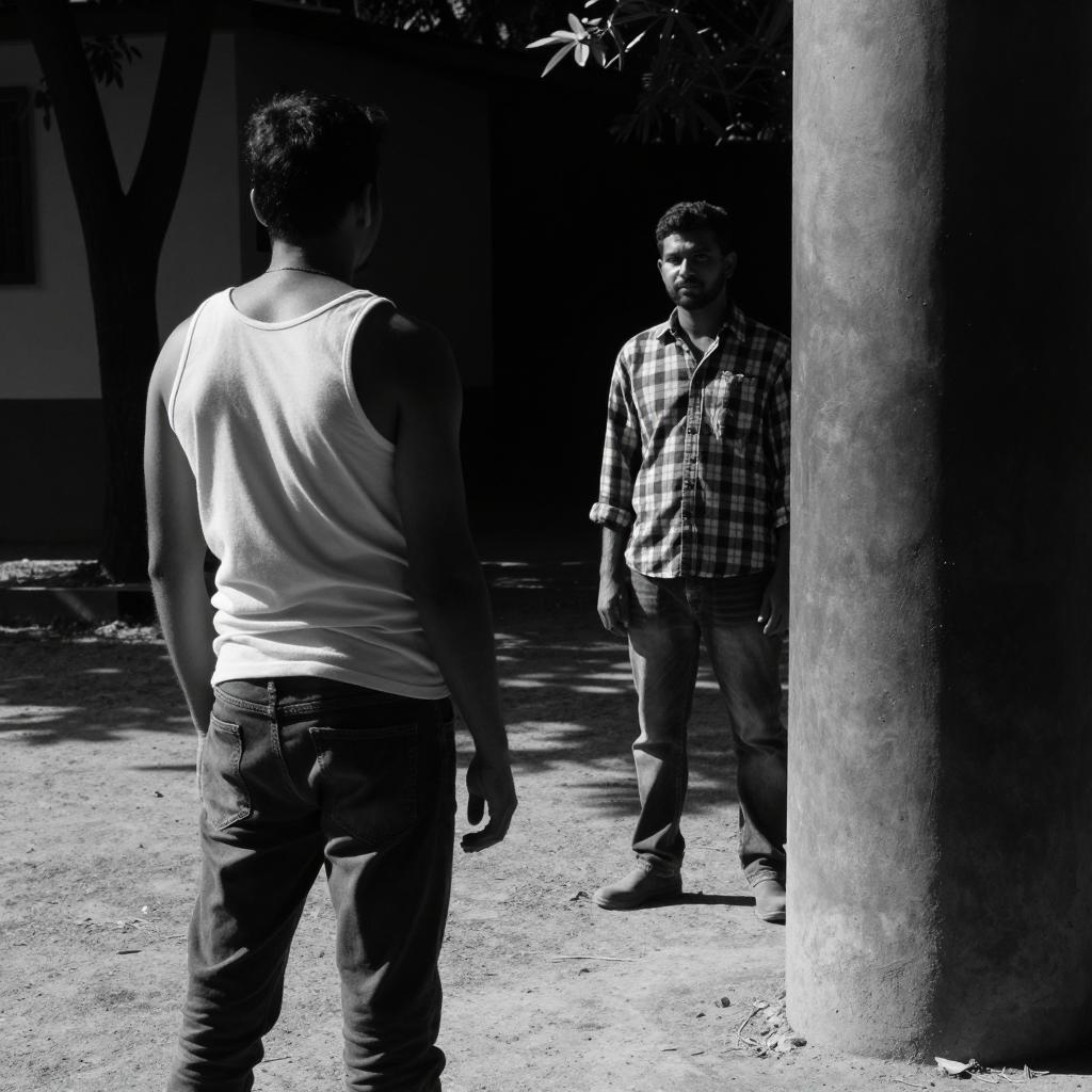 Black and white photograph. Two men in a dark, outdoor setting. Foreground man, back view, tank top, jeans, hands at sides. Background man, checkered shirt, jeans, facing forward, standing on dirt ground. Large cylindrical object to right. Tree and building partially visible in background. Shadows and light contrast create depth.