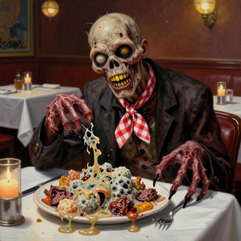 Action pose, action position a painting by frank frazetta and jeremy mann A zombie sits at a table in a restaurant, a red-and-white checkered napkin tied around its decaying neck, In front of it lies a plate overflowing with moldy, putrid food, covered in fungi and oozing with an unidentifiable, foul-smelling slime, Despite the grotesque sight, the zombie wears a wide grin, its yellowed teeth gleaming with a bizarre sense of delight, as if it’s about to enjoy the feast of its unlife, The restaurant’s ambiance, with its pristine tablecloths and softly glowing candles, creates a stark yet comical contrast to this macabre yet oddly cheerful scene