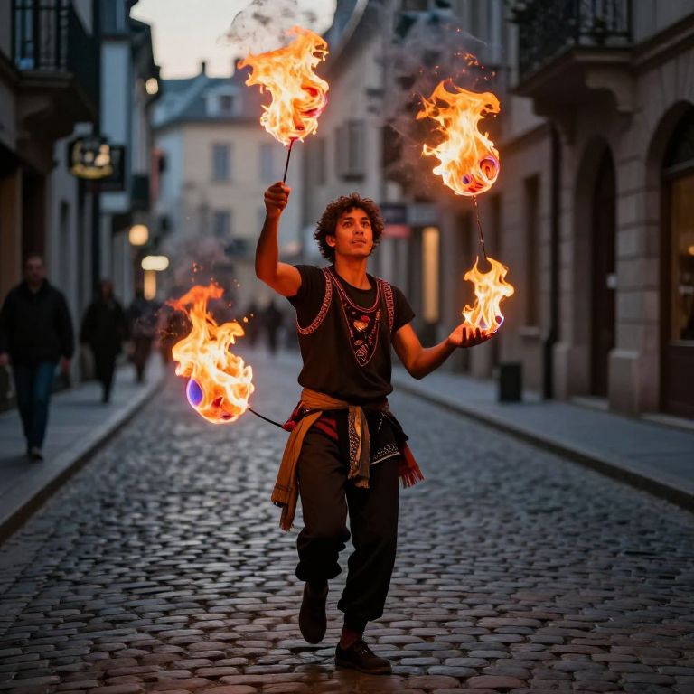 A digital artwork depicts a street performer skillfully juggling vibrant, fiery orbs amidst a cobblestone street, creating a mesmerizing blend of realism and fantasy through dramatic lighting and high-definition visual effects.