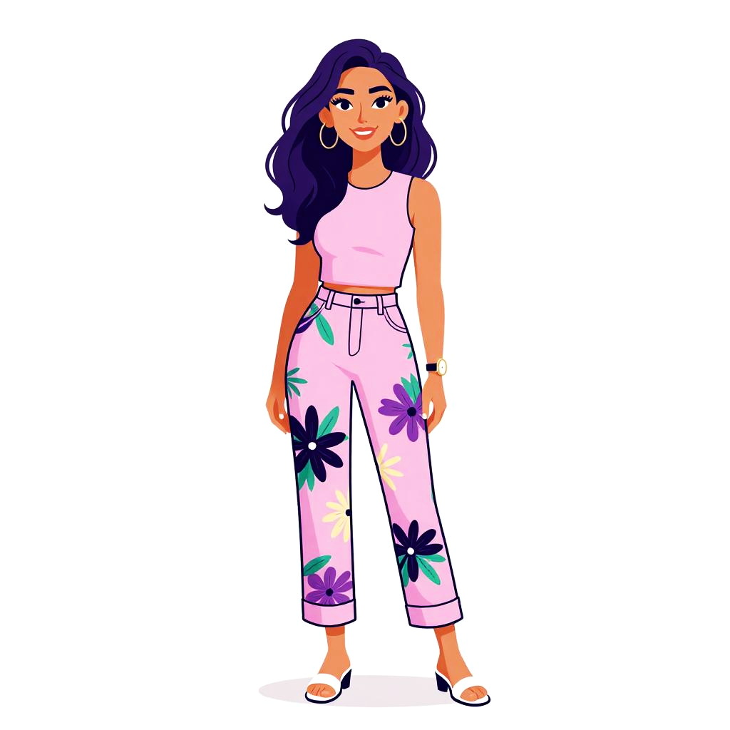 Woman with pretty face and pretty hair. smiling Woman, contemporary boho, white cropped blouse with short puffed sleeves and front tie detail, high-waisted midi skirt with floral print, sheer panel near hem, dark chunky sneakers, layered chain and pendant necklaces, minimal makeup, casual hairstyle, white studio background. --sref 1467