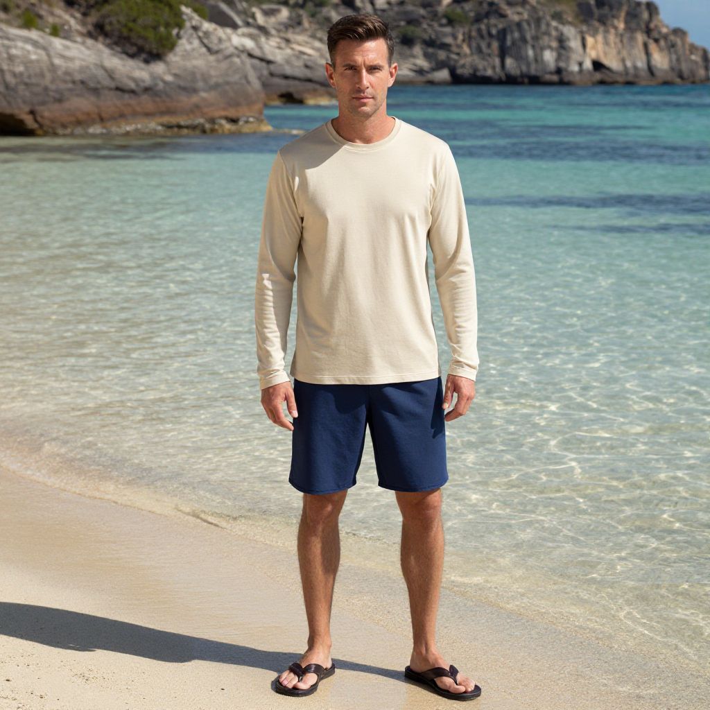 "a man, soft bamboo blend long sleeve tee in sandy beige, solid navy boardshorts, dark brown leather flip-flops, secluded cove, crystal-clear water, sun-dappled sandy shore, camera obscura style, relaxed expression, enjoying the tranquility. Man has masculine face and piercing eyes"