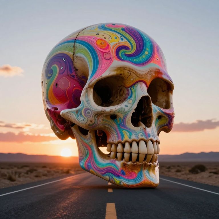 A colorful, futuristic skull with flowing, vibrant patterns looms over a desolate road at sunset.