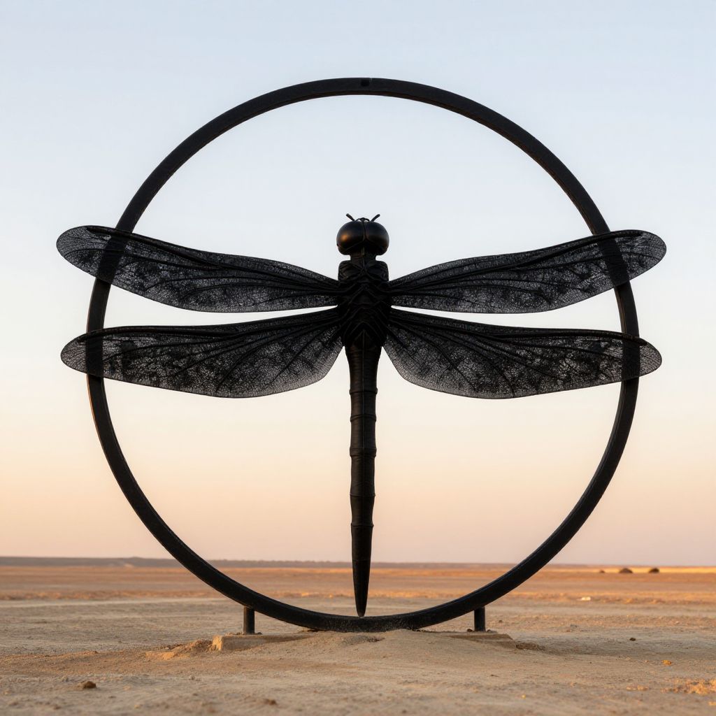 Photograph of a black metal sculpture of a dragonfly with detailed, textured wings, standing within a large, circular frame. The sculpture is centered in a barren, sandy desert landscape under a clear sky transitioning from light blue to pale orange near the horizon. The dragonfly's body is slender and vertical, with its wings extending outward in a symmetrical pattern. The circular frame is simple and unadorned, creating a stark contrast against the soft, pastel-colored sky and the sandy ground. The sculpture's silhouette is bold and striking against the delicate gradient of the sunset.