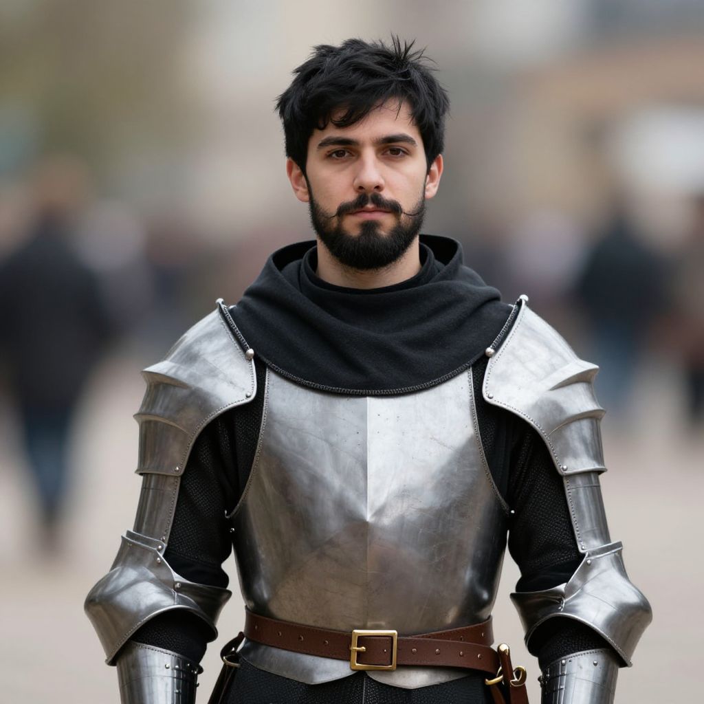 England knight costume, 1boy, male focus, solo, facial hair, hood, beard, belt, blurry background, blurry, looking at viewer, black hair, mustache