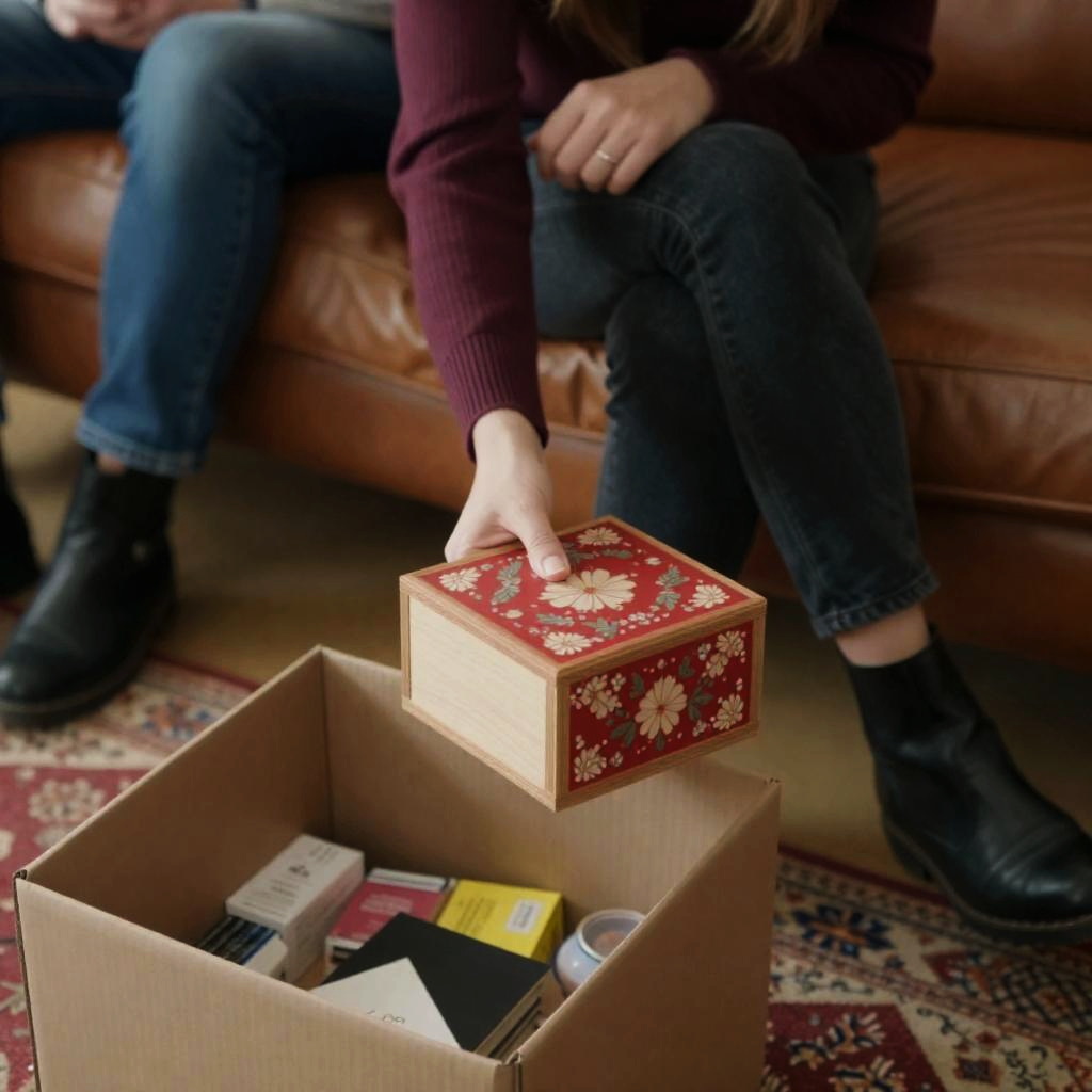 Photograph of a woman in a burgundy sweater and dark jeans holding a small, red, floral-patterned wooden box, seated on a brown leather couch. Another person, partially visible, sits next to her in blue jeans and black boots. Cardboard box with miscellaneous items on the floor. Rug with red and beige patterns. Woman's hand holding box is closest to the camera. Person's leg extends over the box. Casual indoor setting.