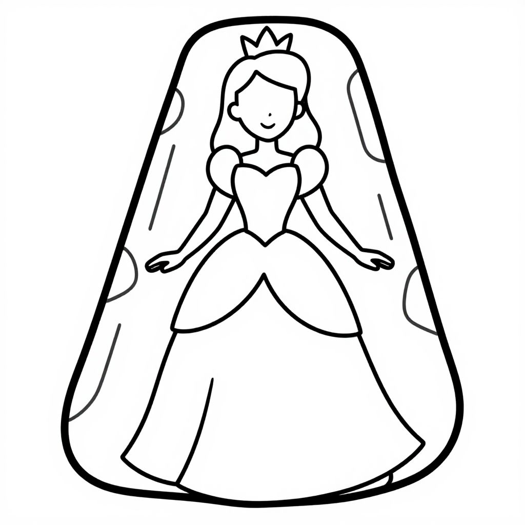 Black and white line drawing of a princess with a long gown and flowing hair, standing in a large, oval frame. Simple, minimalistic style.