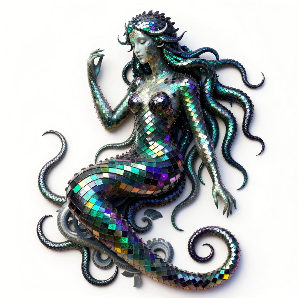 A detailed digital artwork featuring a graceful medusa composed of a mosaic of small, colorful serpentine scales that form a fragmented, pixelated effect. The subject is portrayed in a dark fantasy style, with carefully arranged blocks creating depth and definition. The color palette is vibrant, including shades of emerald green, onyx black, deep purple, silver that reflect light, giving the artwork a luminous quality.