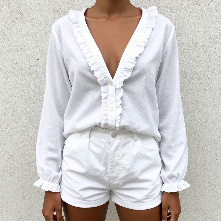 Photograph of a person with a medium-dark skin tone, wearing a white, long-sleeved, deep V-neck shirt with frilled edges. The shirt is unbuttoned, revealing a hint of chest. They are also wearing white shorts. The background is a textured, speckled concrete wall. The image has a slightly washed-out, high-contrast look, making the white clothing stand out prominently.