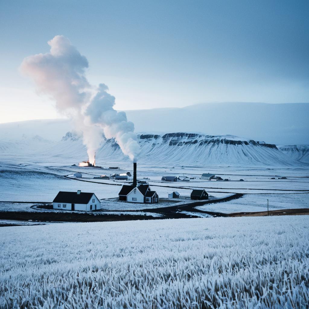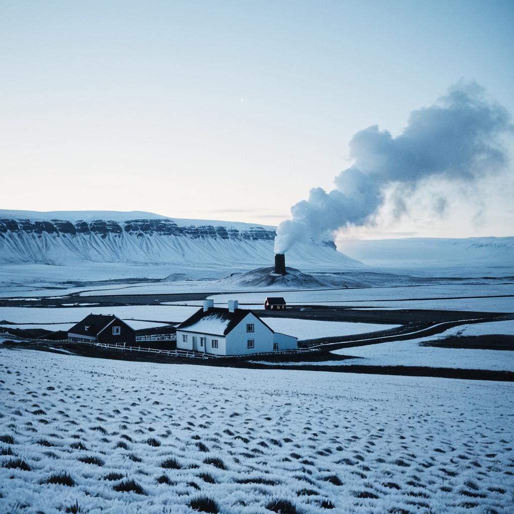 Snow-Covered Icelandic Highlands with Smoke from Chimney