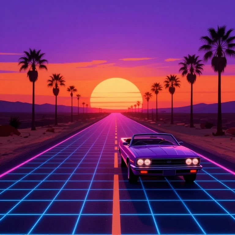 80s art style sports car racing on a neon grid highway, vibrant pinks and blues, digital sunset in background, sharp geometric lines, retro futuristic vibe, high energy and dynamic