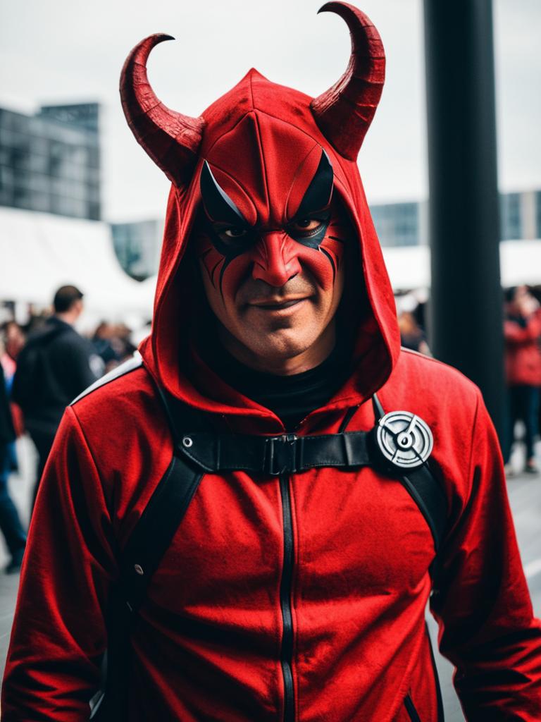 Man in Red Devil Costume, cosplay festival photo, photorealistic realism
