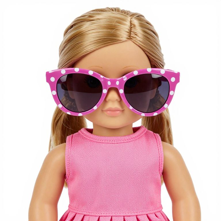 Bright pink polka dot sunglasses rest on a light wooden surface, featuring a playful design with white dots and dark lenses, ideal as a doll clothes accessory for American Girl Wellie Wishers.