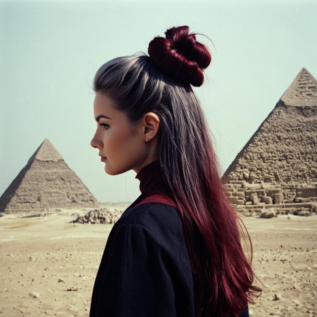 1girl, solo, gray, maroon, absurdly long, half updo hair, hair, pyramid