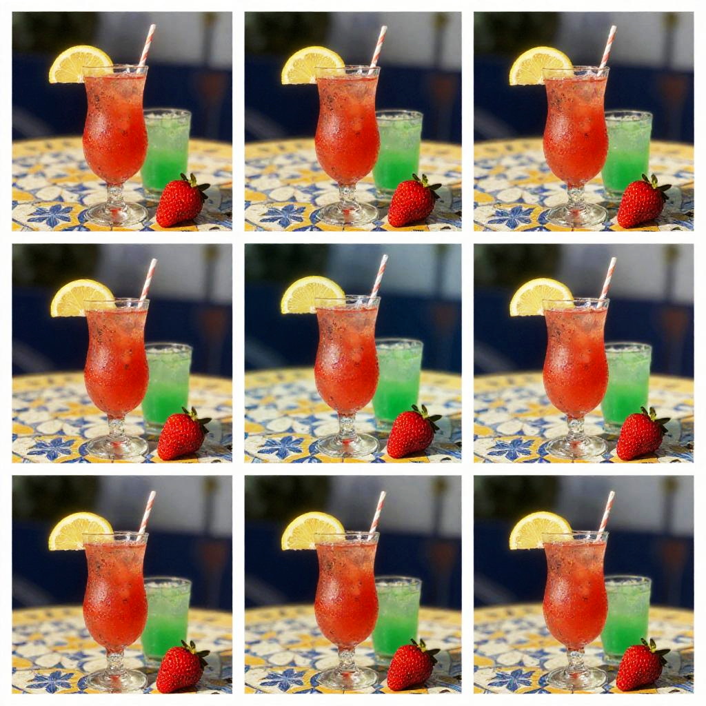 This is a colorful, slightly blurred, composite photograph of six small images arranged in a grid. Each image features a vibrant red cocktail with a lemon slice and a red strawberry beside a green drink in a glass, both set on a sunlit, patterned table. The background includes blue and yellow hues, suggesting an outdoor setting with sunlight casting shadows.