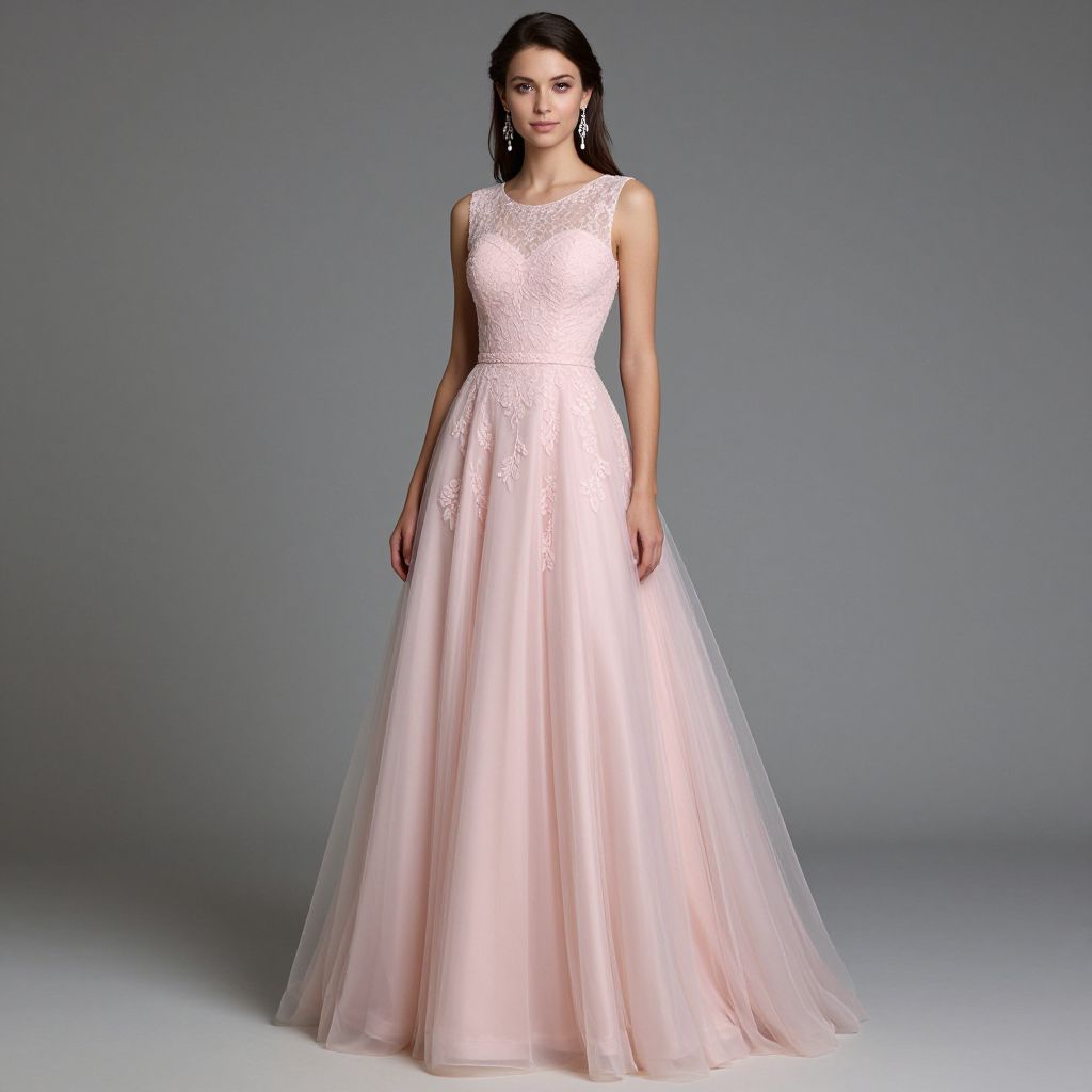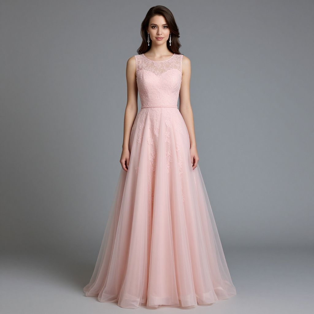 Elegant woman wearing a sleeveless pink round-neck tulle lace long prom dress with a flowing skirt, complemented by dangling earrings against a neutral gray backdrop.