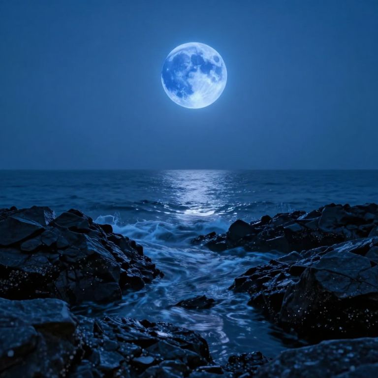 Photograph of a nighttime seascape with a large, luminous full moon casting a bright, blue glow over the ocean. The moon is centered in the sky, its light reflecting off the water's surface, creating a shimmering path. In the foreground, dark, rocky shoreline stretches out, with waves gently crashing against the rocks. The entire scene is bathed in deep blue hues, emphasizing the tranquil yet mysterious atmosphere. The sky is clear, with no other stars visible, focusing attention on the moon's radiant presence. The image has a surreal, almost ethereal quality.
