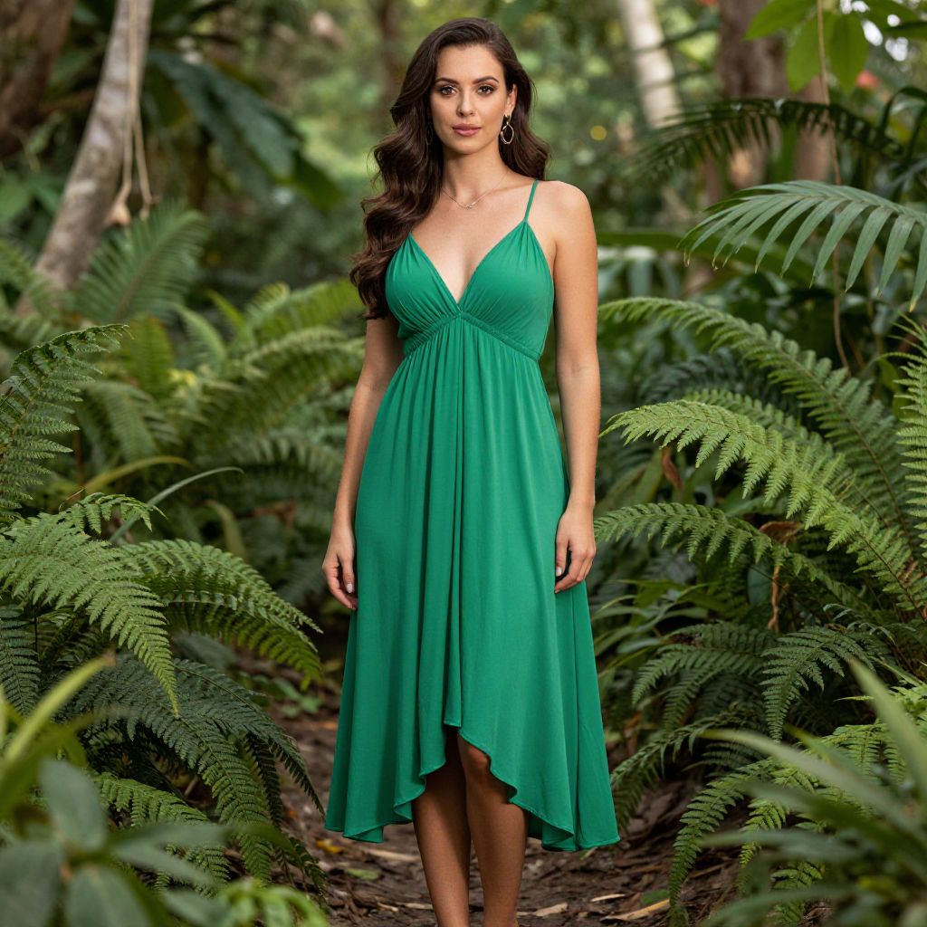 Photograph of a woman standing in a lush, green forest. She has long, wavy dark brown hair, fair skin, and is wearing a sleeveless, deep V-neck, teal green dress that falls to mid-thigh. The dress has a fitted bodice and a flowing, slightly asymmetrical skirt. She stands amid dense ferns and tall trees, with sunlight filtering through the foliage, creating a dappled light effect. The background is rich with greenery, and the forest floor is covered in leaves and twigs. The woman has a calm, confident expression and is centered in the image.