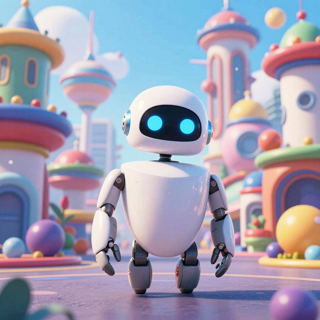 AI generated Pixar style scene featuring a whimsical robot character exploring a vibrant futuristic city, bright colors and intricate details, soft lighting with a magical atmosphere, animated movie quality, playful and heartwarming mood