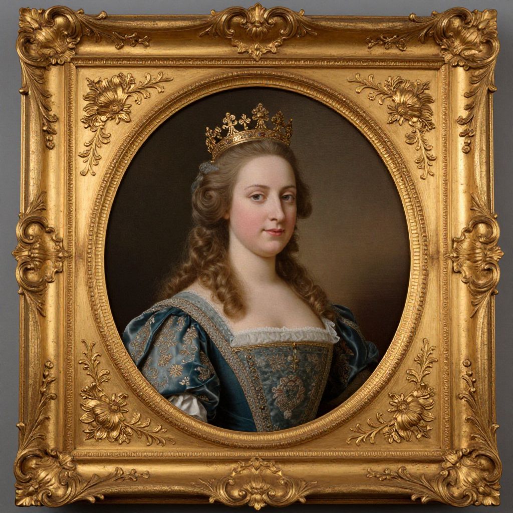 Photograph of a classical portrait painting of a young white woman with fair skin and brown, curly hair. She wears a gold crown and an ornate, blue velvet dress with puffed sleeves and intricate gold embroidery on the bodice. The portrait is oval-shaped and framed in an elaborate, gilded wooden frame with floral carvings. The background of the painting is dark, highlighting the subject. The woman gazes slightly to her right with a calm expression. The overall style suggests 18th-century European aristocracy. The frame's golden color and detailed carvings contrast with the dark background of the portrait.