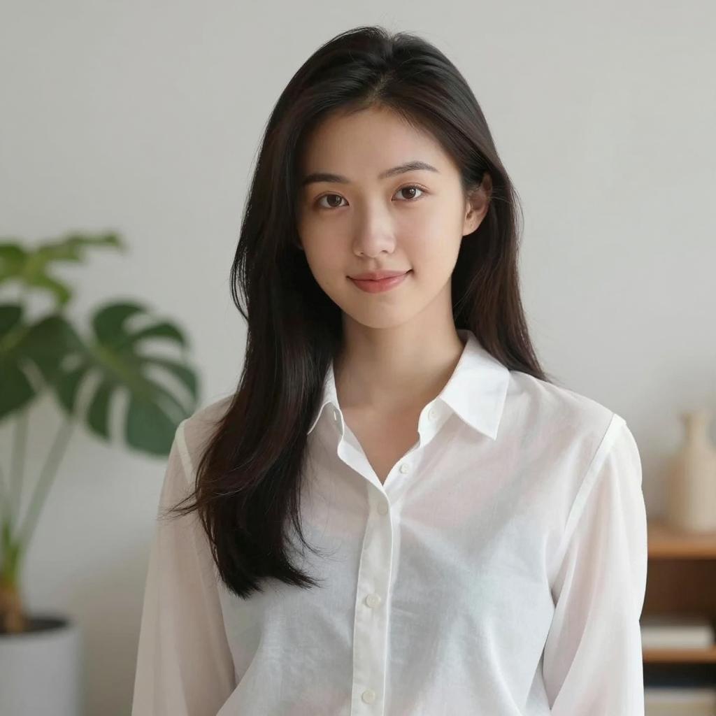 A young woman stands confidently in a well-lit library, surrounded by rows of books. She wears a stylish white top adorned with intricate patterns, complementing her long, flowing hair. The warm ambiance highlights the sophistication of the setting, making it an ideal backdrop for someone who loves literature and learning.