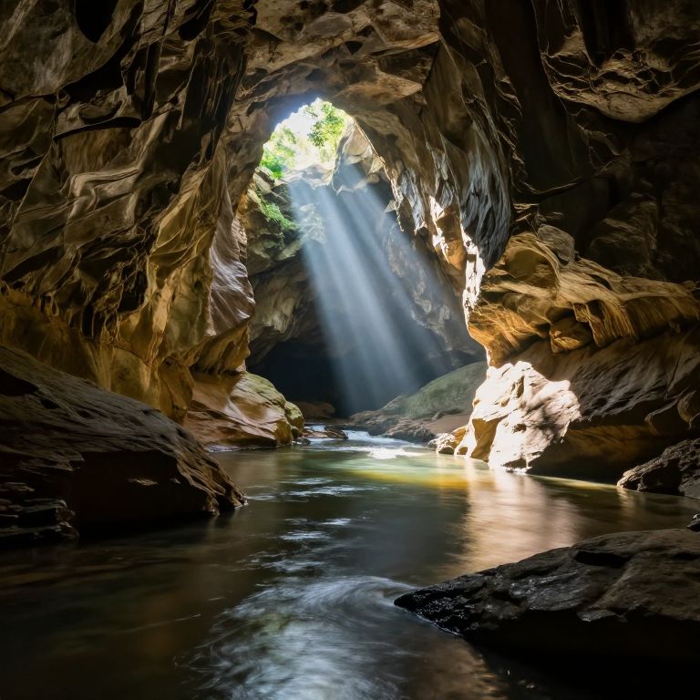 Sunlight streams through a luminous opening above, illuminating a serene underground river flanked by rugged rock formations and casting intricate patterns of light and shadow throughout the cavernous expanse.
