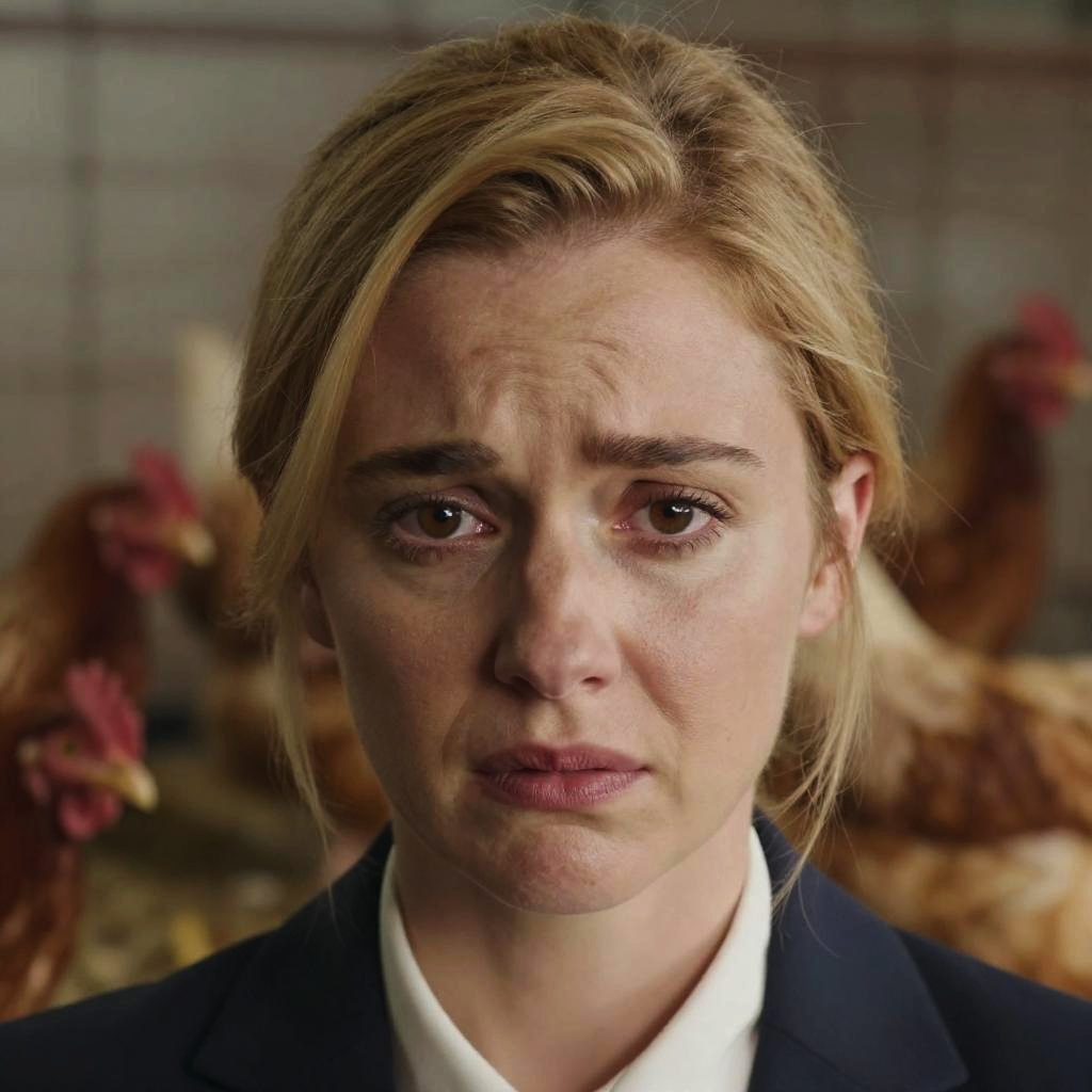 Photograph of a Caucasian woman with fair skin and blonde hair, styled in a side part. She has a serious, slightly worried expression with slightly furrowed brows and subtle makeup. She wears a dark navy blazer over a white shirt. The background is blurred, showing several brown chickens with red combs and a tiled wall, suggesting a farm or chicken coop setting. The lighting is natural, highlighting her facial features. The overall mood is tense and focused.
