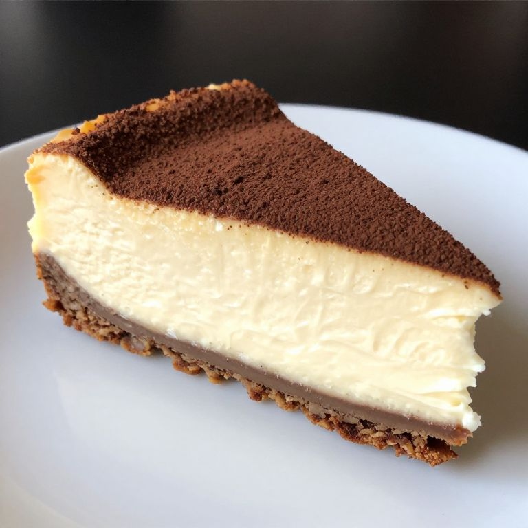 Luscious slice of triple-chocolate cheesecake, featuring a rich dark chocolate ganache topping, a smooth and airy chocolate cheesecake layer, and a dense chocolate crust, all presented on a pristine white plate.