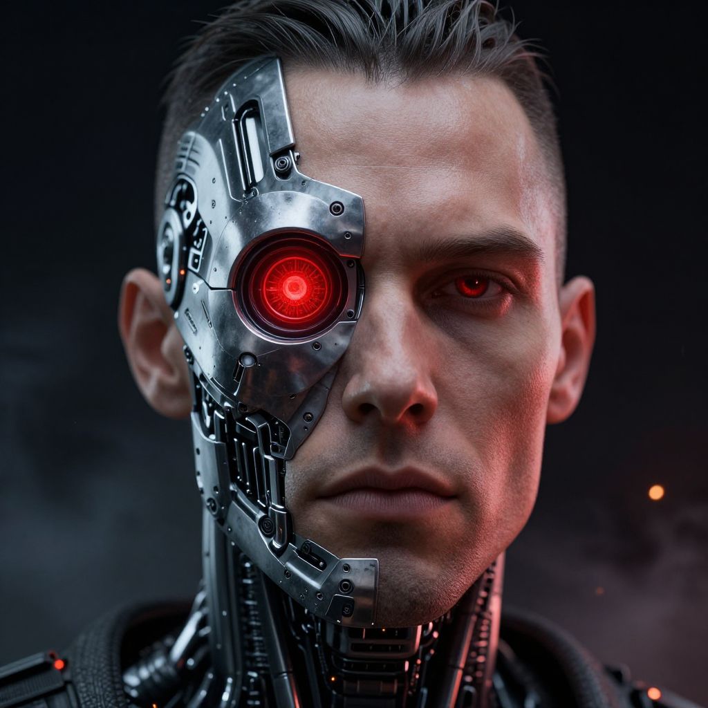 Terminator half face portrait, detailed cybernetic implants merging with human skin, glowing red robotic eye, futuristic metal textures, dark sci-fi background with sparks and smoke, hyper-realistic style, dramatic lighting