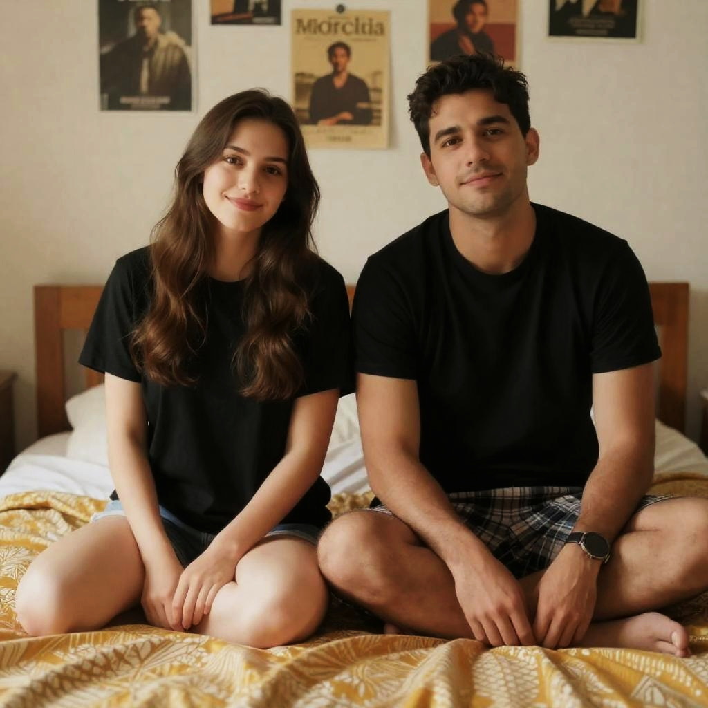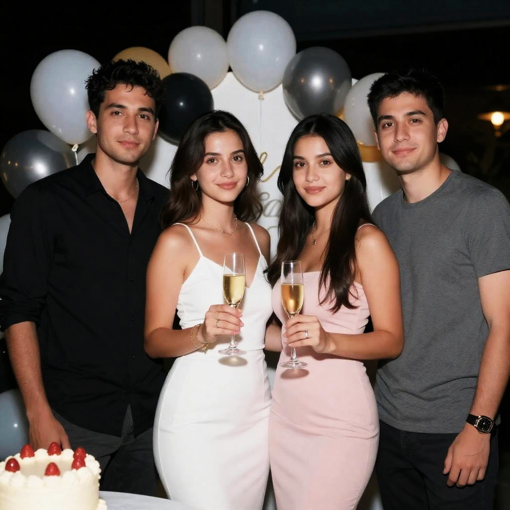 Four young adults posing at a party with dim lighting. Two women in front wearing elegant white and pink dresses, each holding a champagne glass. Two men standing behind them, one in a black shirt and the other in a gray t-shirt. Background decorated with white, black, and silver balloons. A table with a white cake topped with strawberries in the foreground.