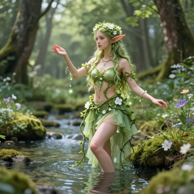 Dnd spring eladrin druid gracefully intertwined with vines and flowers, glowing with spring energy, delicate fairy-like features, standing beside a crystal-clear spring in a lush forest clearing