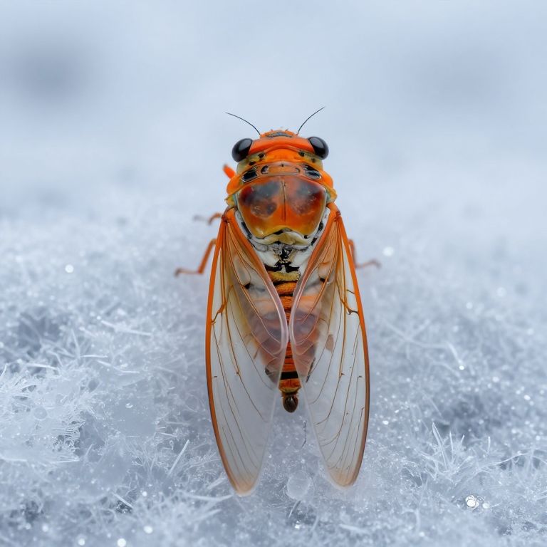A digitally rendered cicada with translucent, feathered wings stands poised on a frosty surface, its vibrant orange hues contrasting against the icy backdrop, evoking a surreal, high-definition blend of natural wonder and artistic imagination.