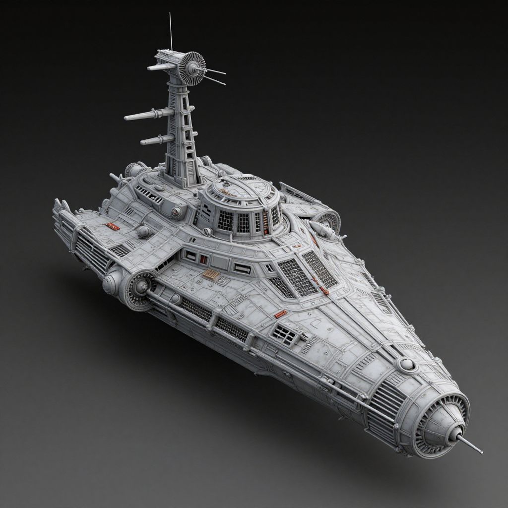 Photorealistic CGI of a detailed, white, futuristic spaceship with intricate designs, antenna, and vents, floating against a dark gradient background.