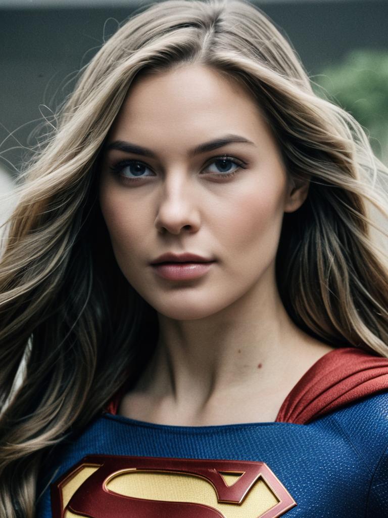 Woman in Supergirl costume, photorealistic close-up headshot with flowing hair