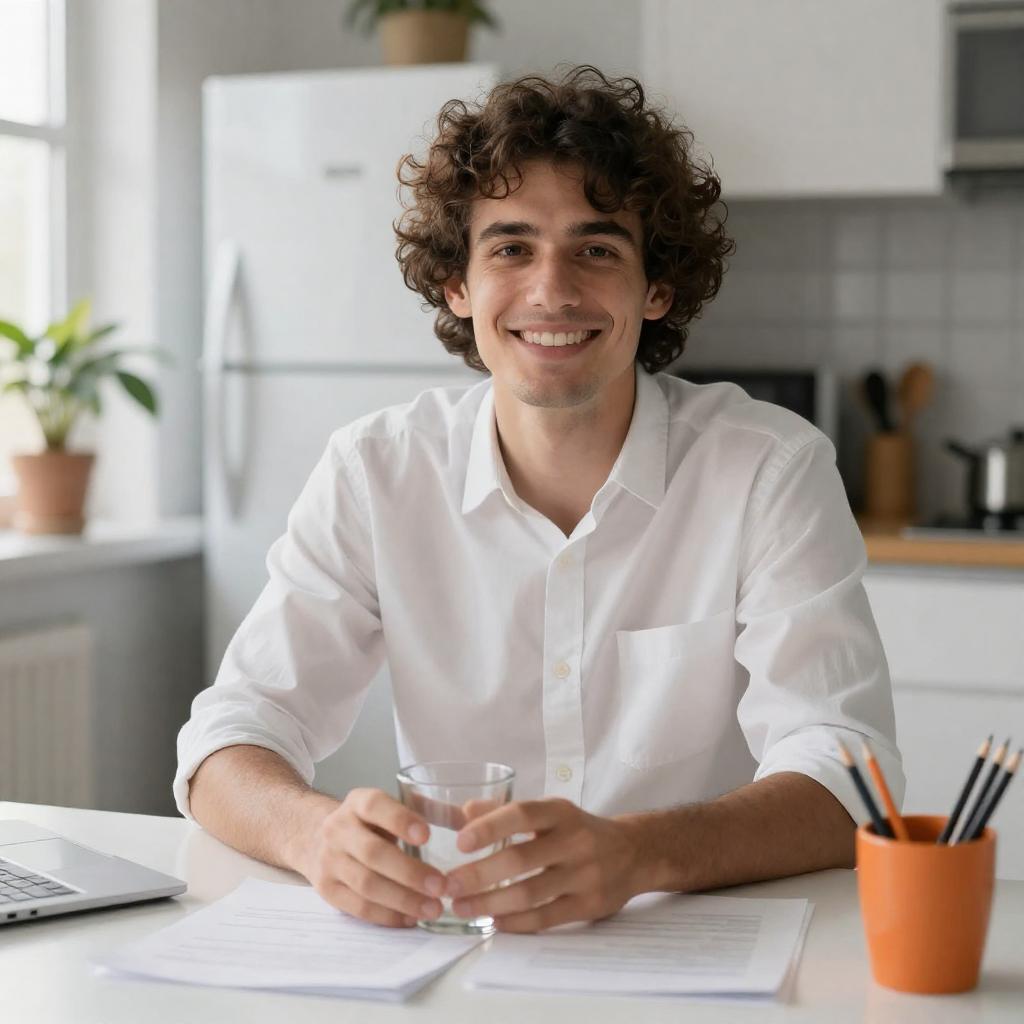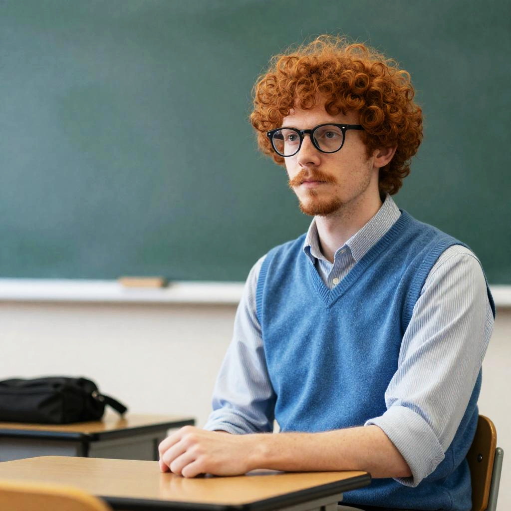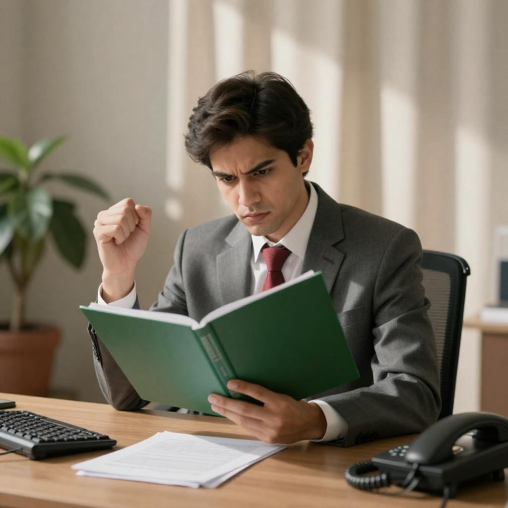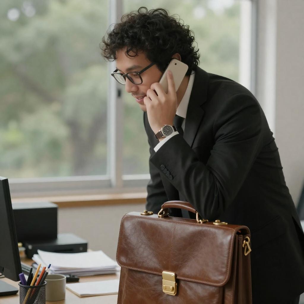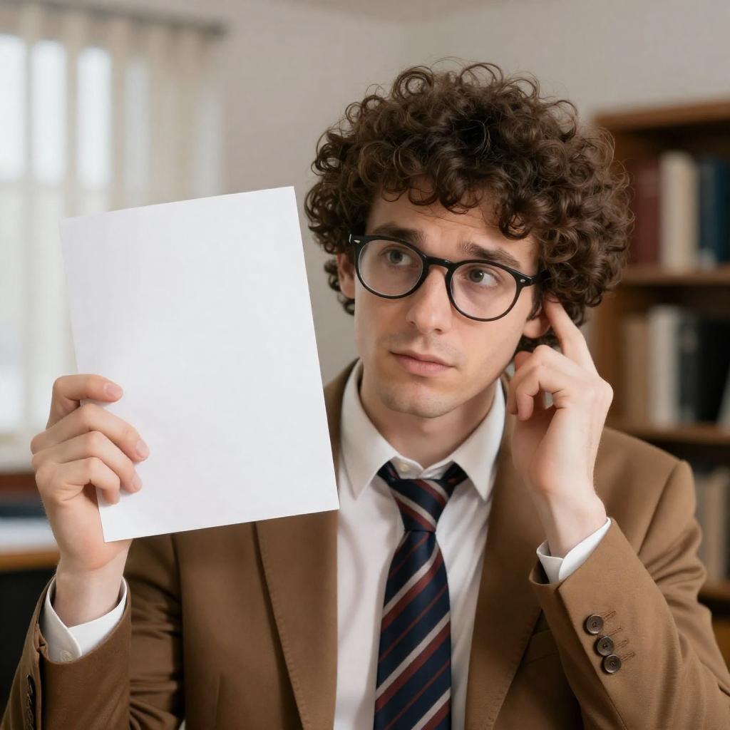 Photograph of a man with curly brown hair and glasses, wearing a brown blazer, white shirt, and striped tie, holding a blank piece of paper to his ear. He looks slightly puzzled. Background includes vertical blinds, bookshelves, and a window. Office setting.