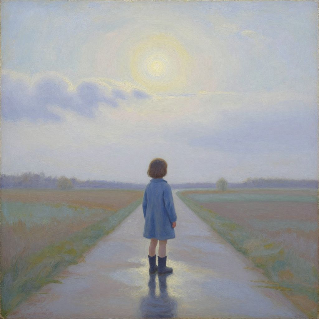 This is a digital painting depicting a child with short brown hair standing on a wet, reflective country road. The child, wearing a blue coat, black socks, and shoes, is viewed from behind, gazing at a bright, partially cloudy sky with the sun high in the center. The road stretches into the horizon, flanked by fields on either side with subtle hues of green and brown. The soft, pastel colors and gentle brushstrokes evoke a serene, nostalgic atmosphere. The child's small figure and the expansive landscape create a sense of solitude and contemplation.