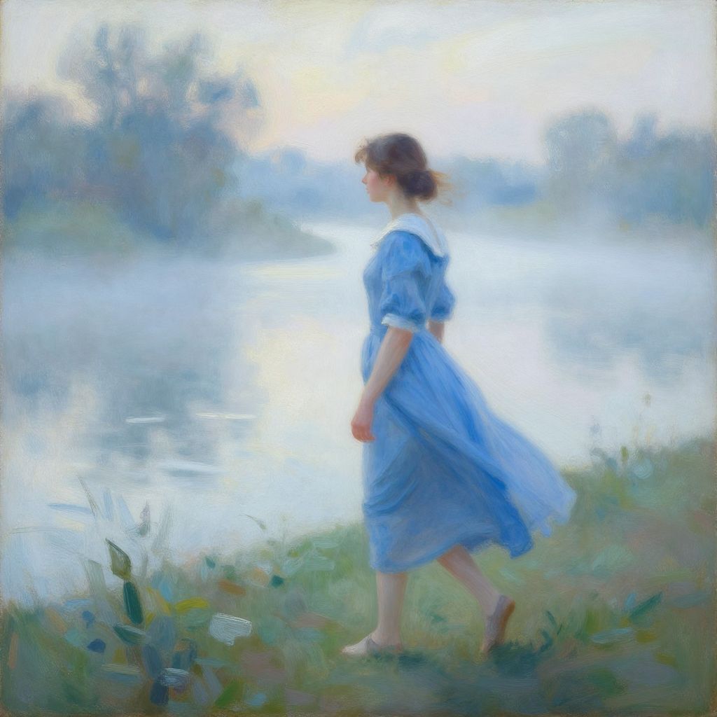 Symbolic painting of a child standing on a wet path surrounded by fields under cloudy twilight skies. The child is wearing a blue coat and boots, gazing towards a pale, glowing celestial light in the sky. The artwork emphasizes pale blues and soft pastels in a style reminiscent of Anselm Kiefer.