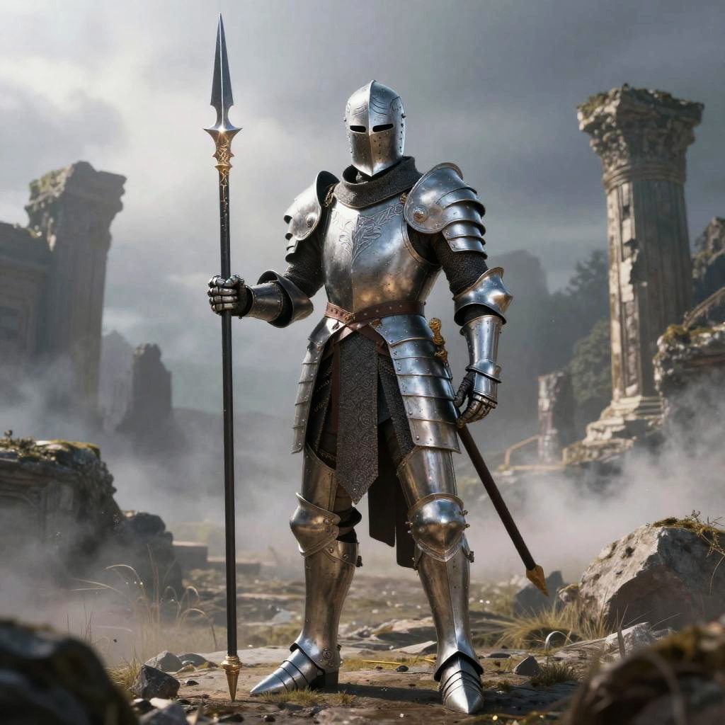 Epic fantasy knight armor featuring spiked pauldrons and glowing emerald gems, standing guard in a mystical ancient ruin, swirling magical energy around, detailed textures and vibrant fantasy colors