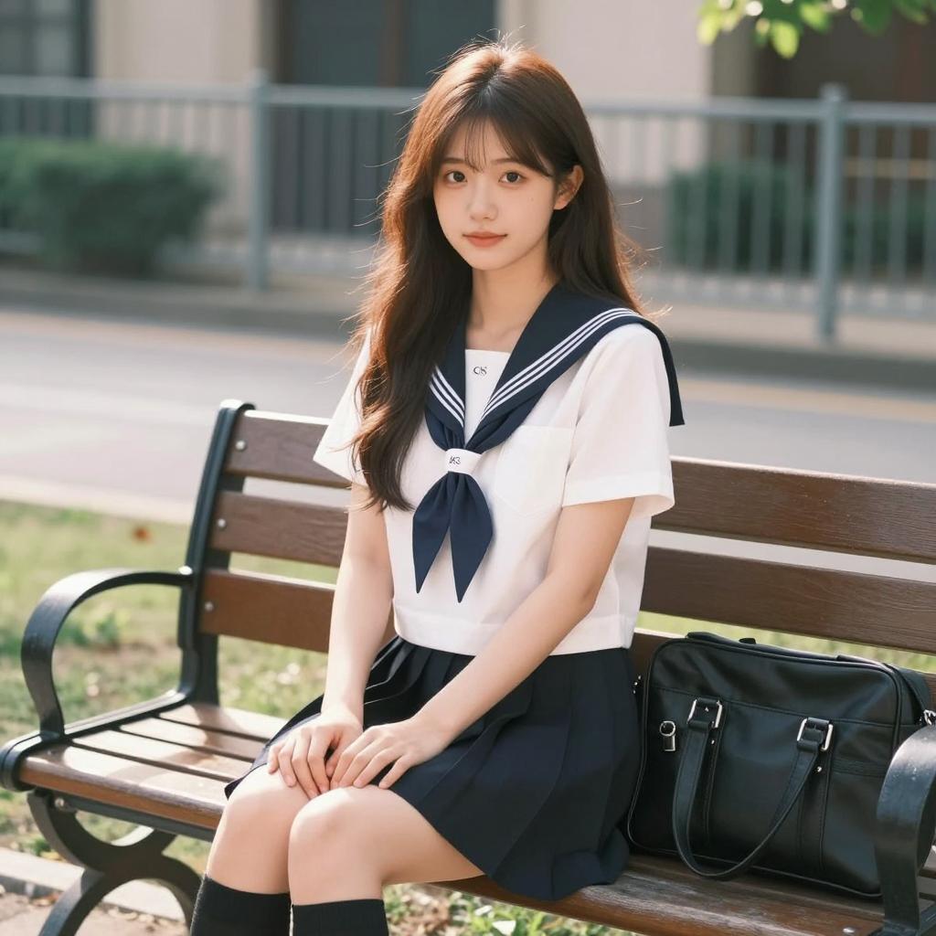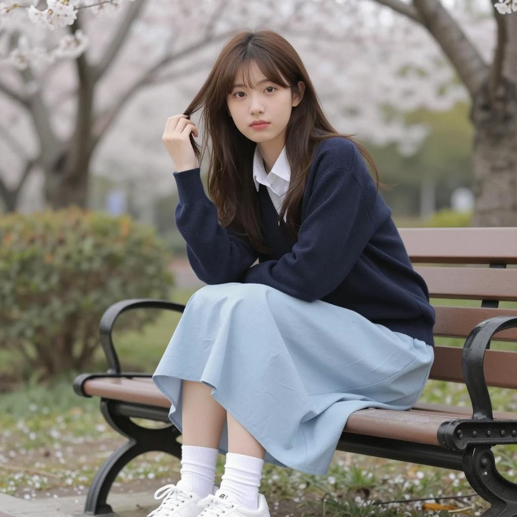 Asian girl with long black hair, bangs, and orange hairclip, sitting on a wooden bench in a park. She wears a black sweater, white shirt with red bowtie, gray plaid skirt, and black knee-high socks. Kneeling with right hand raised to chin. Background: blurred greenery and trees. Sunlight casts soft shadows.