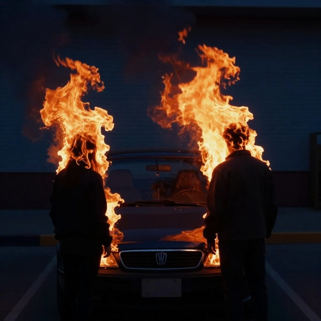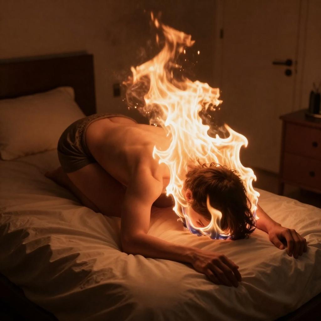 Photograph of a bed with a person on all fours, engulfed in bright flames, head down, back arched. Beige pillow and wrinkled sheets. Nightstand on right. Doorway in background. Flames illuminate person's back. Intense, chaotic scene.