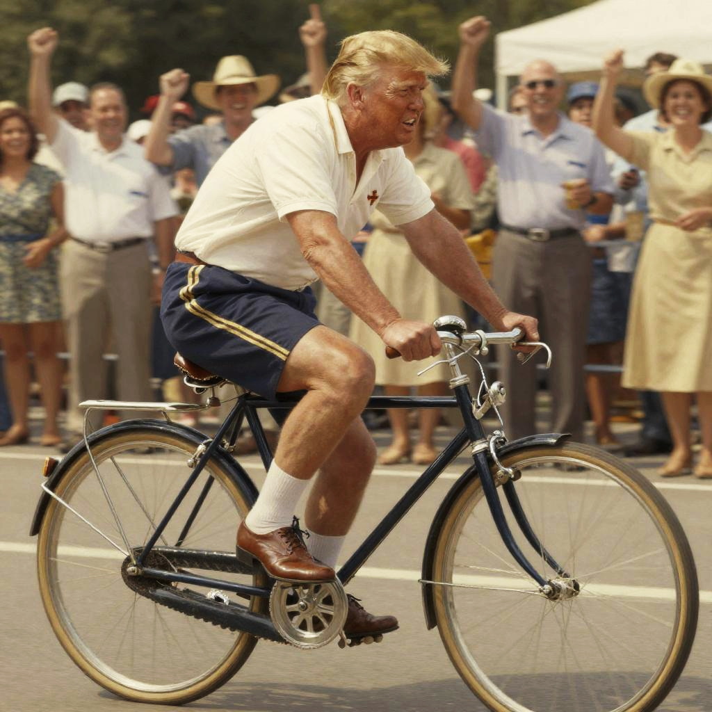 Trump on a bike participating in a vintage cycling race, dressed in retro sportswear from the 1950s, classic bike with leather saddle and chrome details, cheering crowd in the background, warm toned lighting, painterly texture.