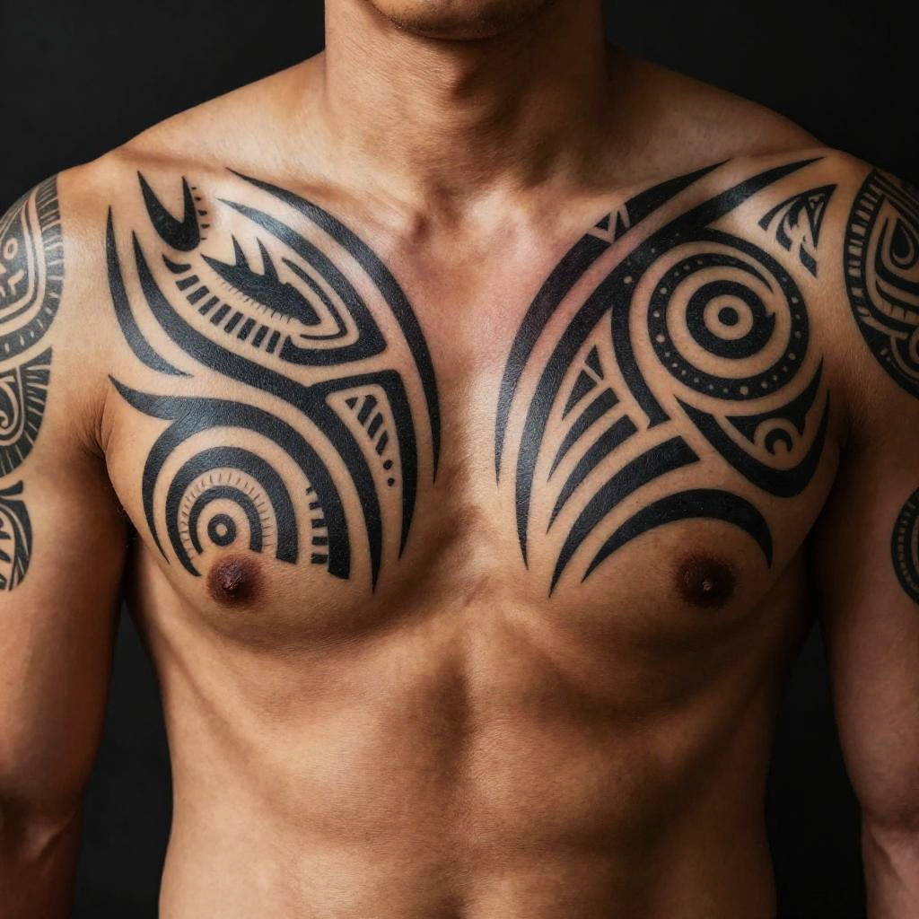 Warrior tribal chest tattoo design on a muscular male, intricate black ink patterns blending bold lines and sharp edges, symbolizing strength and resilience, tribal motifs inspired by Polynesian and Maori art, high contrast on sunlit skin, detailed and dramatic.