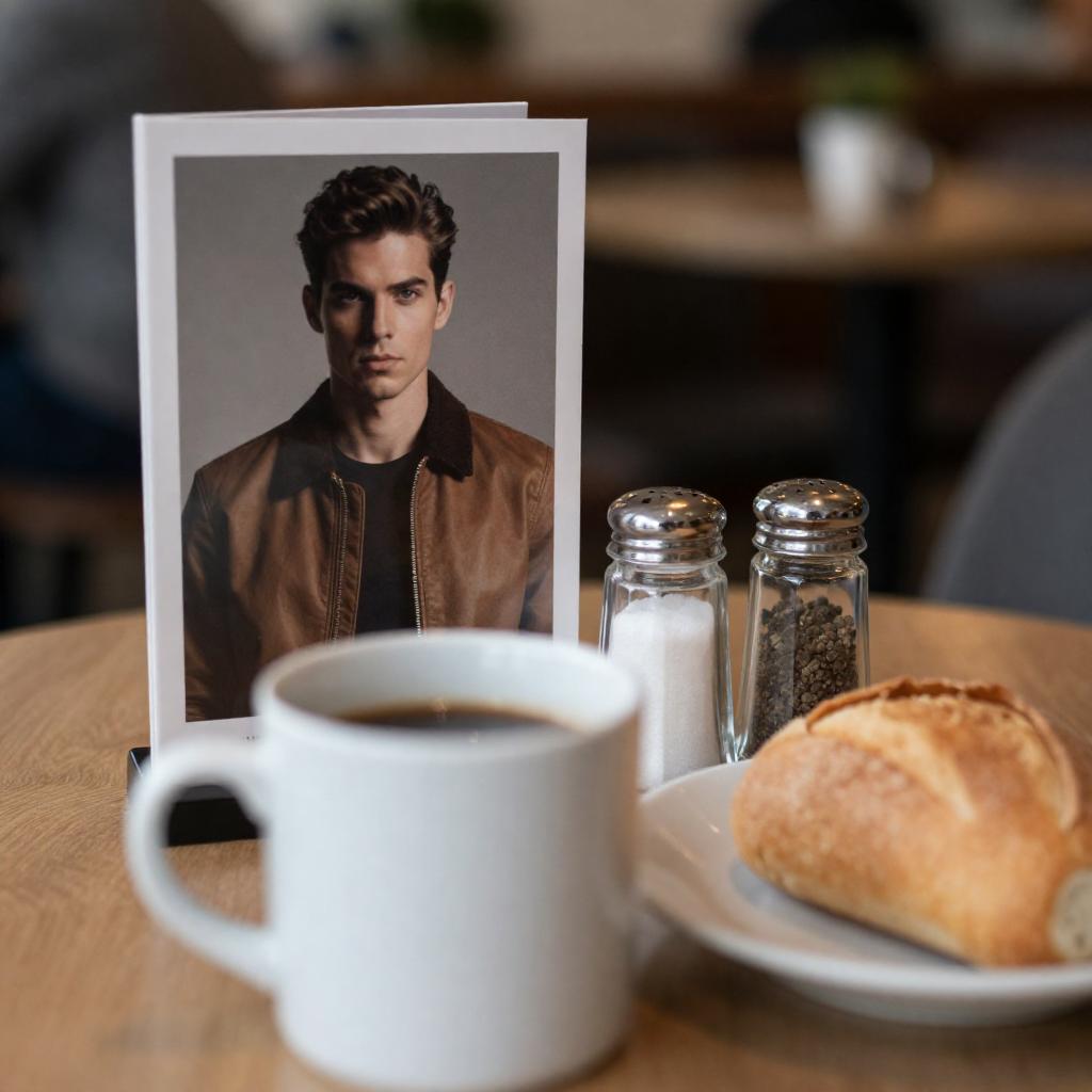 Photograph of a café table with a white mug in the foreground, a bread roll, a glass salt and pepper shaker set, and a menu holder with a photograph of a man in a brown jacket. The man in the photograph has a serious expression. The background is blurred.
