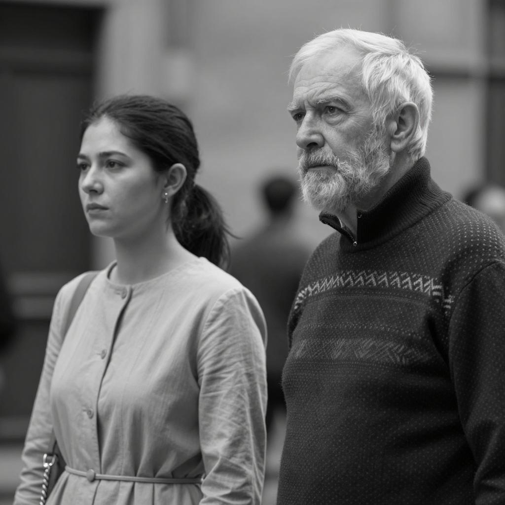 Black and white photo of two people walking. Man in foreground, light-colored jacket, dark shirt, short dark hair, serious expression. Woman in background, slightly blurred, dark hair, light jacket, looking over shoulder. Dome in background. Motion blur.