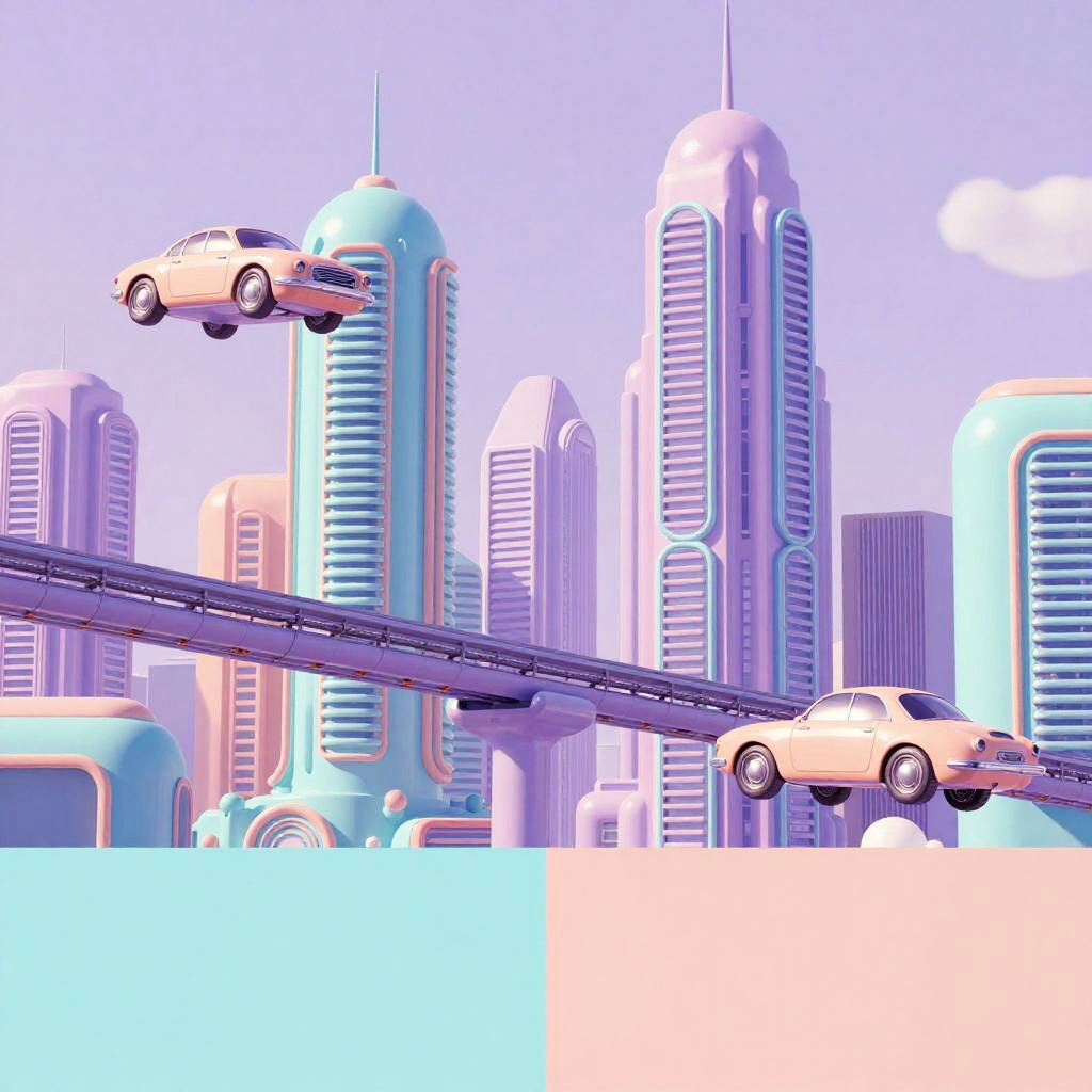Retro futurism color palette showcasing pastel lilacs, bright cyan, and warm peach tones, applied to a futuristic metropolis with flying cars and monorails, rounded edges and glossy textures, evoking a mid-century modern vision of the future in a hyper-realistic illustration.