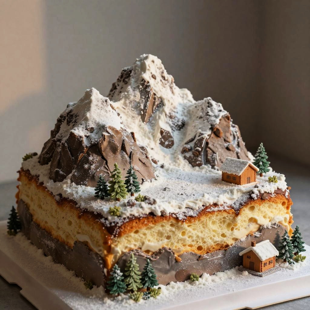 Realistic mountain cake depicting a rugged alpine landscape with layered spongy cake mimicking rocky surfaces, dusted with powdered sugar snow, detailed with edible foliage and small fondant cabins, captured under soft golden hour light for dramatic effect.
