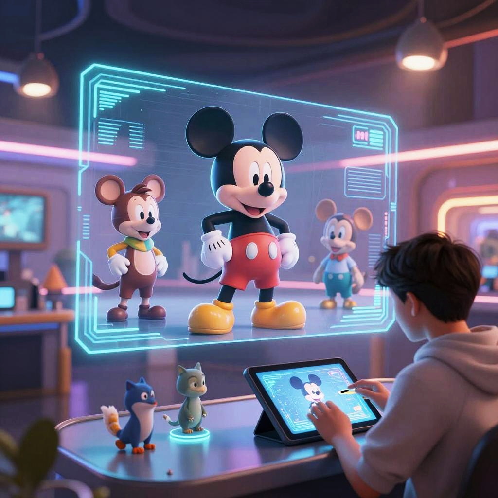 Disney make characters in a futuristic studio with holograms and digital tablets, artists bringing to life new animated heroes and animals, bright neons, sleek designs combined with the classic Disney charm, dynamic lighting, blending technology and creativity