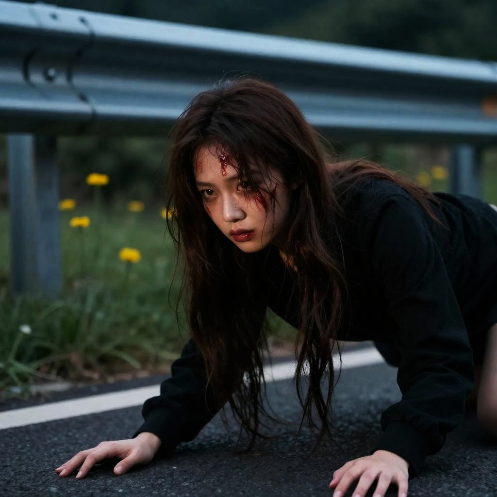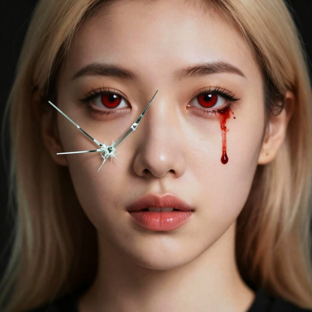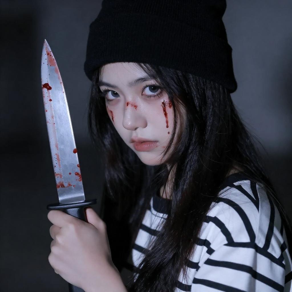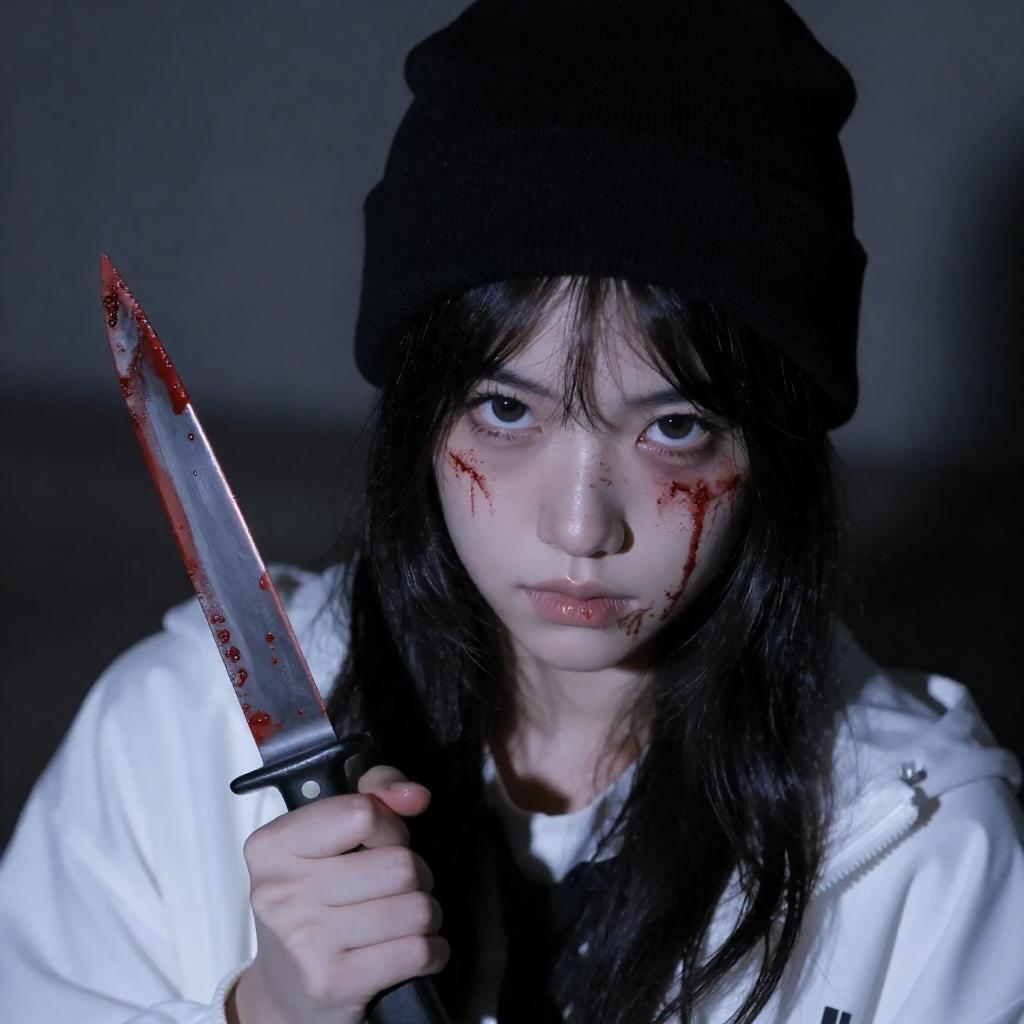 Photograph of a young woman with blood smeared across her face, intense eyes, and dark hair under a black beanie. She holds a large, blood-stained knife in her right hand, gripping it tightly. She wears a white and black striped shirt. The background is dark and blurred, emphasizing her fierce expression and the knife.