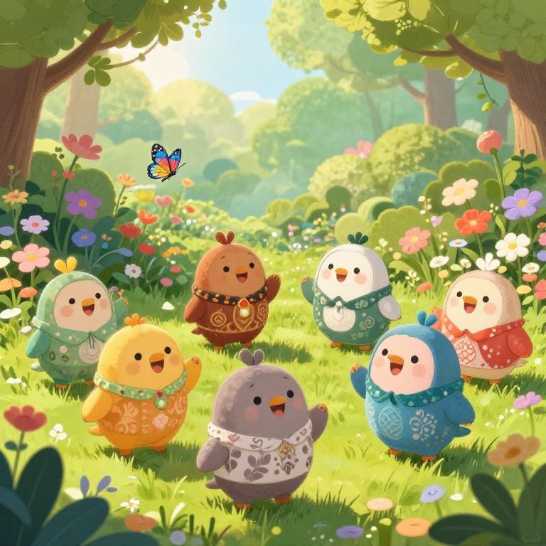 A group of pelones characters playing in a lush garden, surrounded by blooming flowers and butterflies, whimsical and cheerful mood, bright colors, intricate patterns on pelones clothes, soft morning sunlight filtering through tree leaves